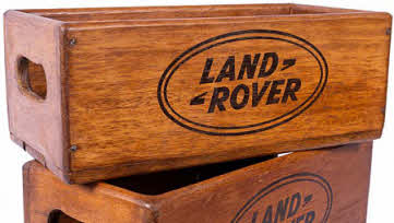 Pair of solid wooden storage boxes with the famous Land Rover logo on the sides and handles on the ends for easy carrying. The larger box measures 28 x 22 x 15 cms, with the slightly smaller box fitting neatly inside for easy storage