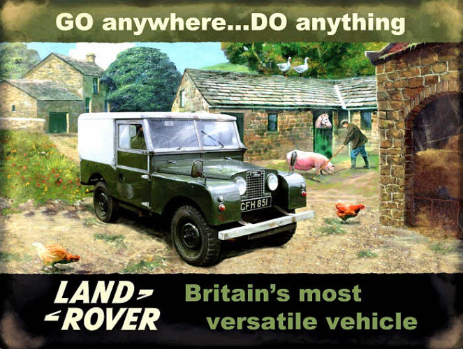 A striking metal wall painting/sign in the style of a 1950s classic Land Rover advert.